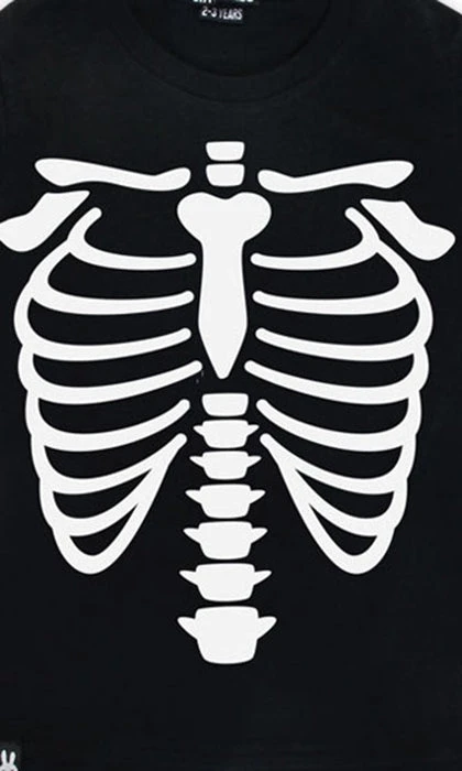 The ideal shirt for an aspiring little goth! A black shirt with a cool printed rib cage. It’s perfect for Halloween or everyday wear for the alternative boy or girl!