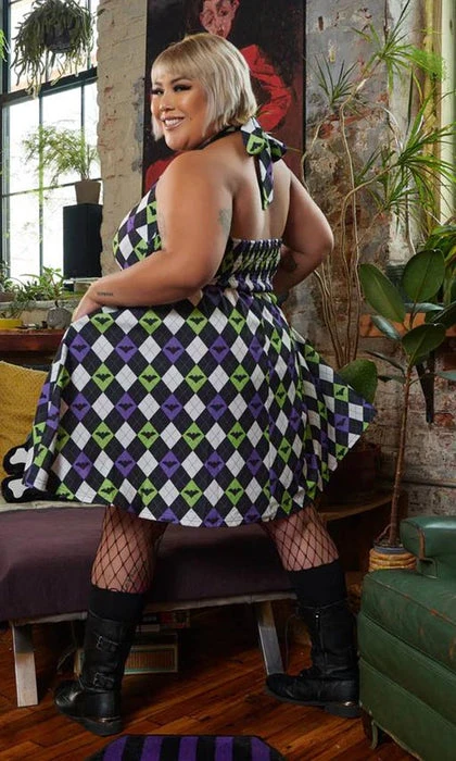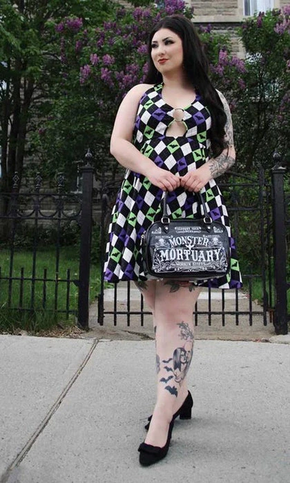 The new Bat Argyle Peekaboo Halter dress isn’t a want, it’s a NEED! This amazing swing dress has it all; a halter neckline with an o-ring detail, peekaboo cutout, smocked back bodice, and pockets! Not to mention an absolutely amazing green and purple bat argyle print – there’s no way you can resist! Pair it with some fishnets and some heels for a stunning look.