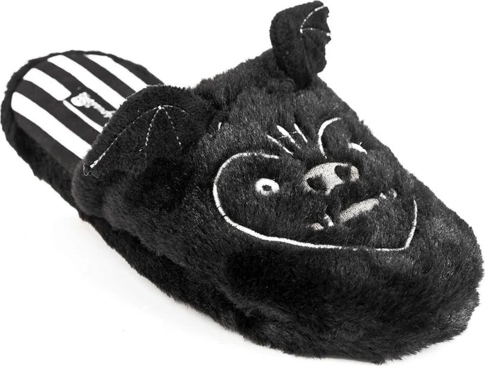 Lounge about your bat cave in spooky style with these adorable Furry Bat Slippers! Designed by Sourpuss in house and made of a soft and plush black faux fur, they feature embroidered details, little bat wings, and Sourpuss’ signature black and white stripe lining. A memory foam lined cushion bottom keeps you comfy.
