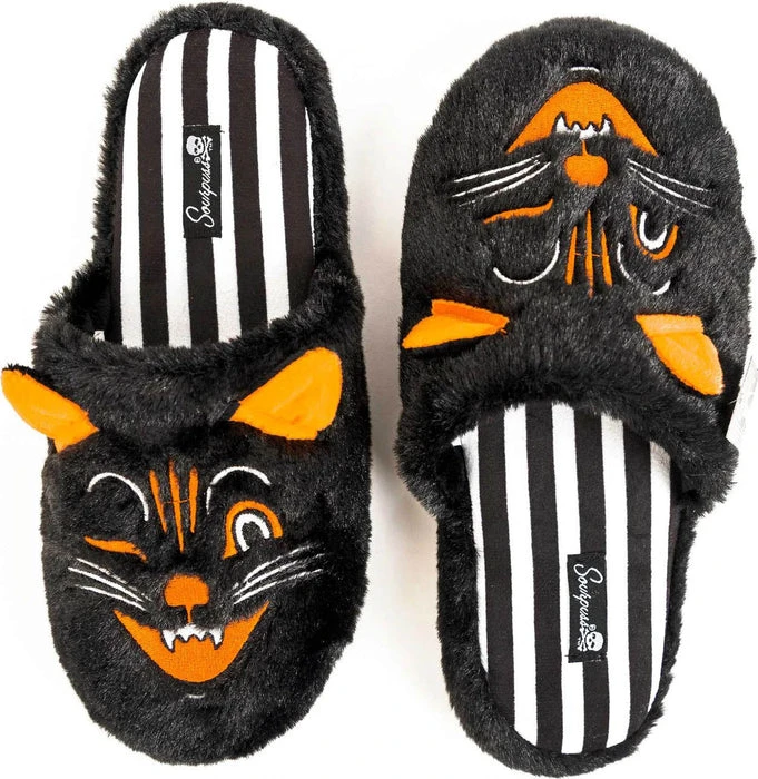 What’s black, orange, and furry all over? The Jinx the Cat Slippers! Slip your paws into these positively amazing slippers on cool mornings and lazy days for ultimate comfort. They’re made of a soft and plush black faux fur with embroidered details, little kitty ears, and Sourpuss’ signature black and white stripe lining. A memory foam lined cushion bottom keeps you comfy.