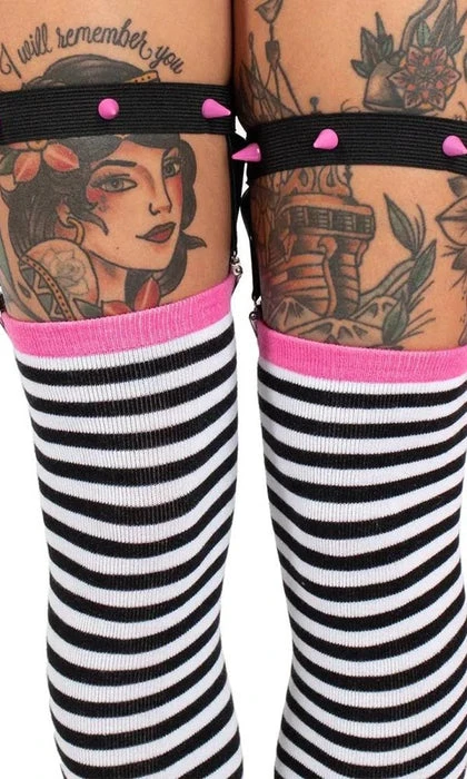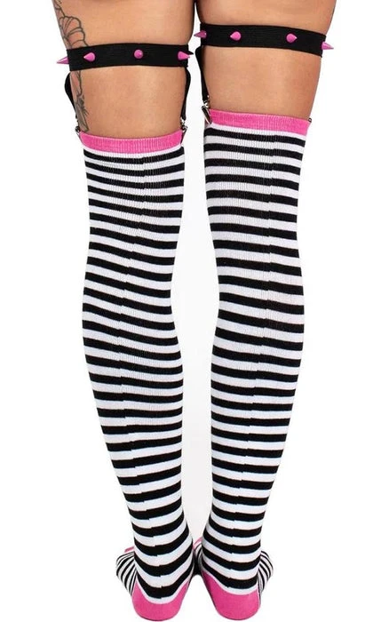 If stripes are good enough for Beetlejuice, they’re good enough for us! These are a Too Fast twist on a classic punk pattern, with pink accents for a feminine touch. They come to just above your knee and feature spooky goth knit-in designs. These thigh-high knit socks are really killer!