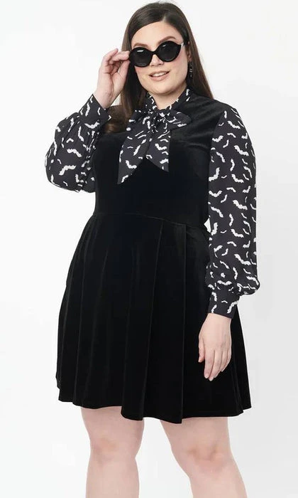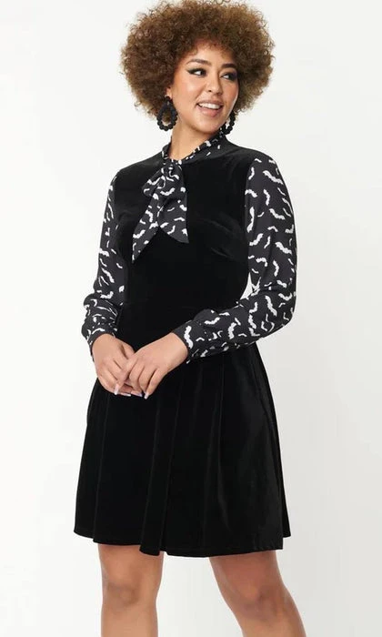 This bewitching flare dress is crafted in black velvet, framed by black long crepe sleeves and centered by a self tie neck bow that feature a spooky print of white bats. Outfitted with a back zipper and side pockets.